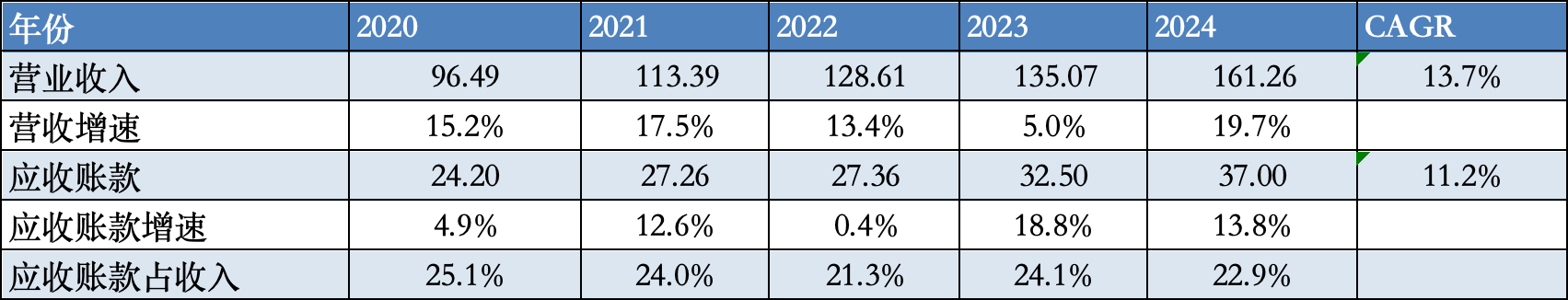 坏账计提比例从2019年的1.32%逐年上升至2024年的3.44%,显示公司营收增长的同时,应收款带来的坏账比例也在提升,整体看收账款坏账计提政策较为稳健。