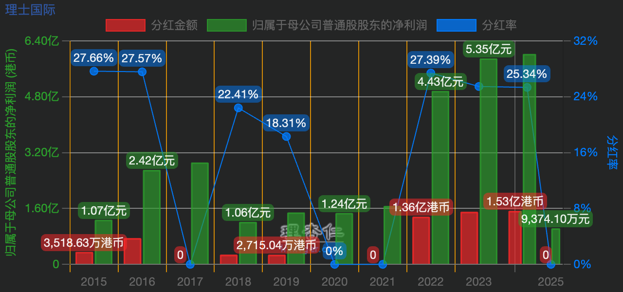 过去 10 年里理士国际有3年没有分红,其它 7 年分红率保持在18%-27% 之间。在2015-10-30以每股0.60港币的成本价购买,截至2025-10-29,共收到分红0.44港币,分红收回的成本比为73.50%。
