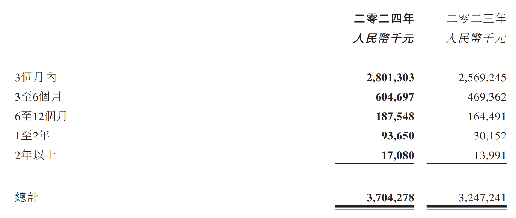 账龄方面,大部分应收款集中在3个月内,2023年和2024年分别为79.2%和75.6%,风险较小,一年以上账龄占比 3% 左右。