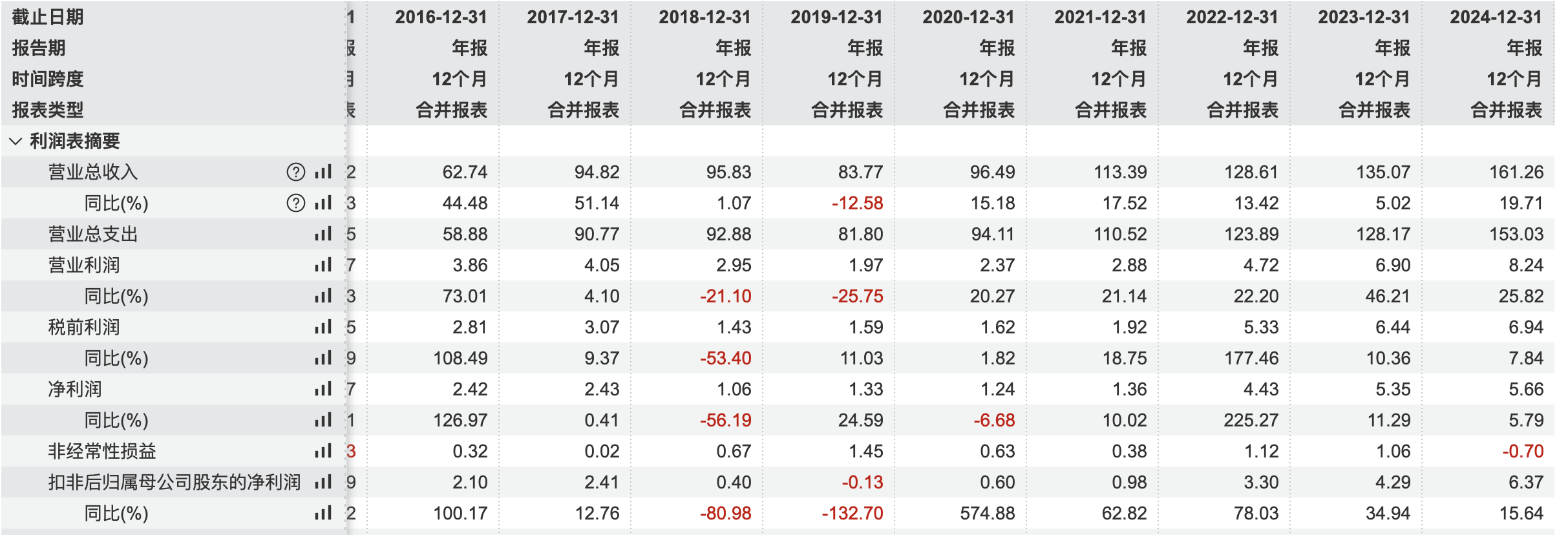 先来看营收,过去10年(2015-2024年),营收从 43.42 亿元增长至 161.26 亿元,年复合增长率为15.7%,过去5年(2020-2024年)复合增长率为13.7%。