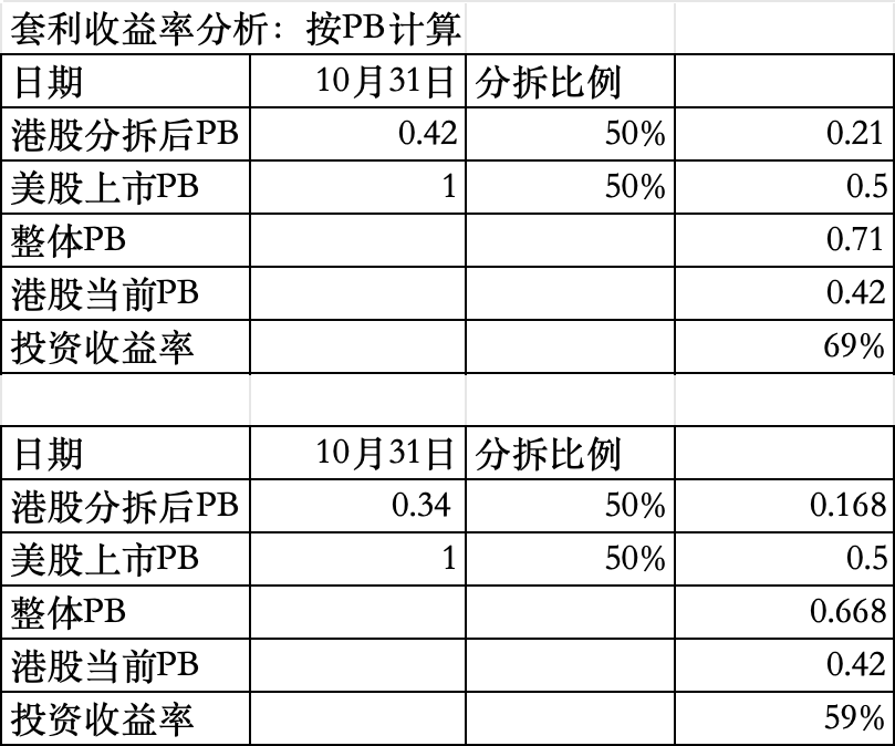 假如美股上市后,港股理士国际 PB 从 0.42 继续下跌20%,则总收益率为:(0.42PB*80%*50%+1PB50%)/0.42PB-1=59%。