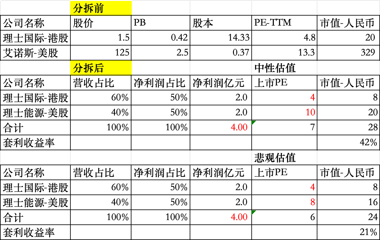 理士国际 股价 1.5 港币,PB为0.42,假设港股保持目前的PB不变,美股上市部分PB按1计算,则总收益率为:(0.42PB50%+1PB50%)/0.42PB-1=69%。
