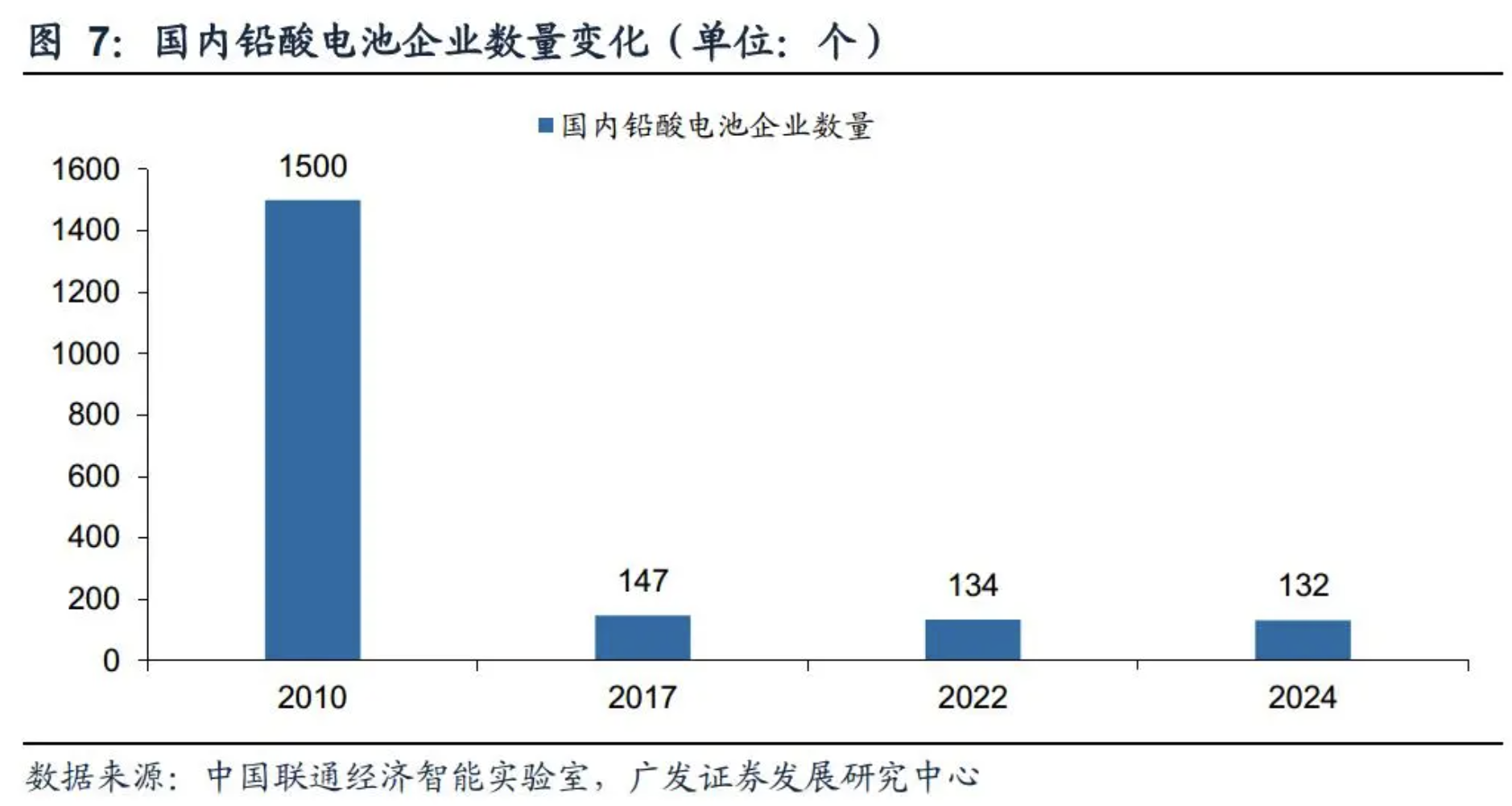 经过近5年调整,根据中国联通经济智能实验室统计,国内铅酸电池企业数量从2012年的1500家大幅下降至2017年的147家,初步实现铅酸电池行业的快速出清。
