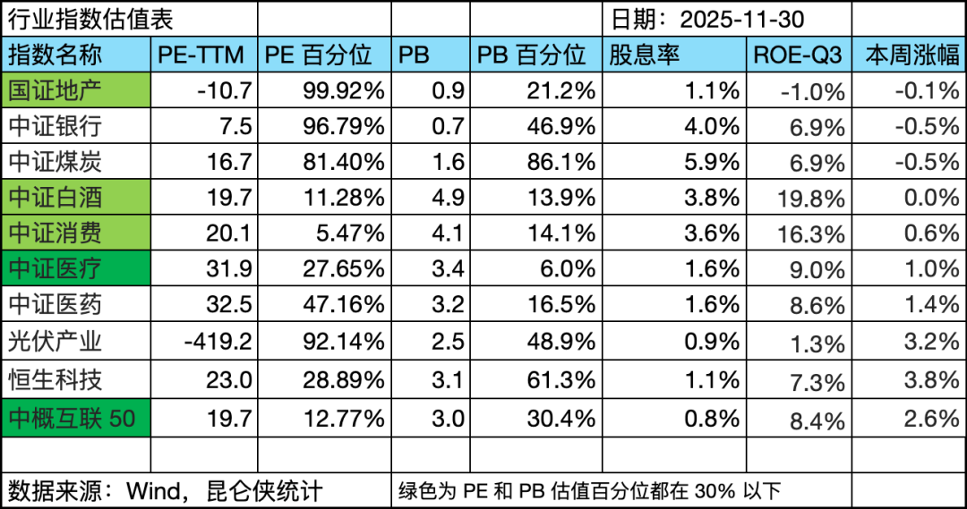 行业指数方面,本周地产、银行、煤炭等红利属性的板块和白酒、消费等逆周期板块表现欠佳,恒生科技和中概互联出现大跌后的反弹。