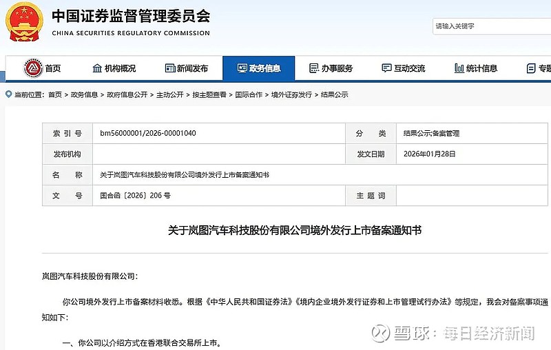 1月28日,证监会国际合作司发布关于岚图汽车科技股份有限公司(简称岚图汽车)境外发行上市备案通知书,终于批了✌️