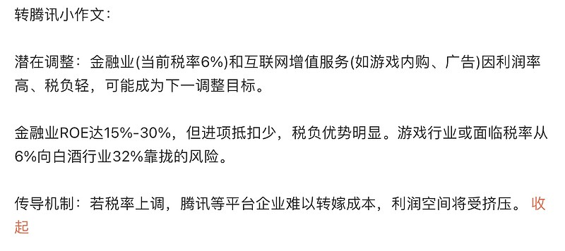$腾讯控股(00700)$ 今天盘中腾讯阿里等互联网企业股价大幅下跌,原来是有小作文传互联网公司的增值税有可能提高,参照电信运营商公司前几天增值税提高。还有提到互联网公司的企业所得税优惠税率会提高。