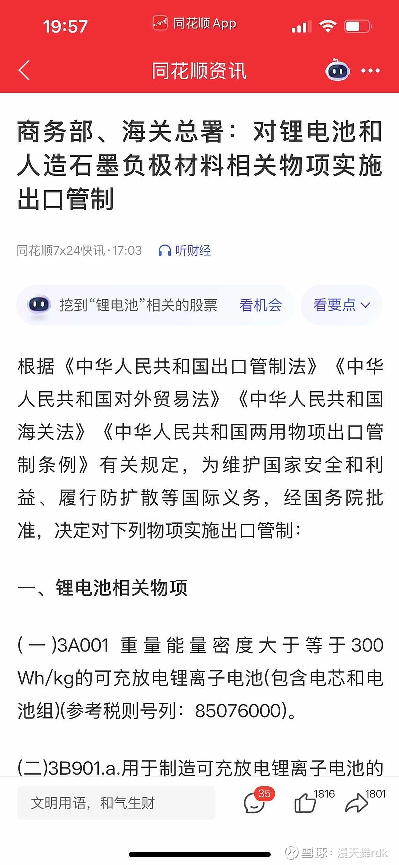 竟然固态电池产业链限制出口啦,估计是会复刻稀土行情,明天的固态电池产业链大概率涨幅榜和热度第一名啦。中国相当于要垄断全球的固态电池及其产业链,同时限制日韩的产业链进展,进而控制新能源汽车的产能。最重要的是限制美帝等对手的军事能力。#赣锋锂业# #欣旺达# #孚能科技#