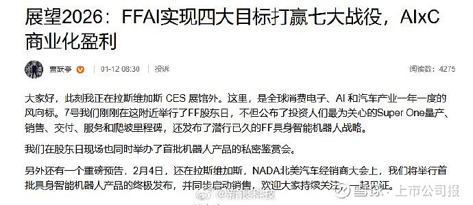 创始人贾跃亭宣布,2月4日在NADA北美汽车经销商大会上,FF将举行首批具身智能机器人产品的终极发布,并同步启动销售。