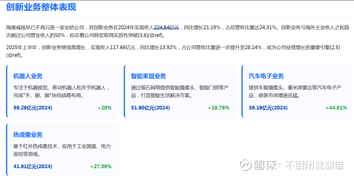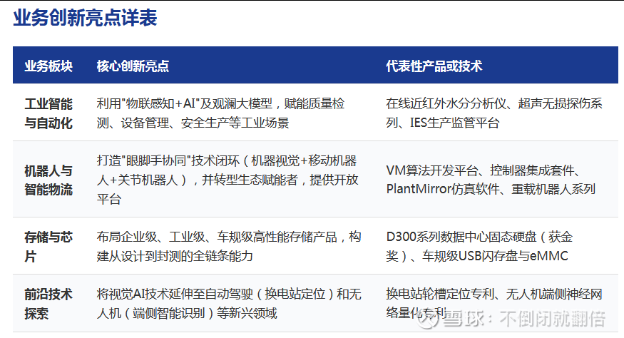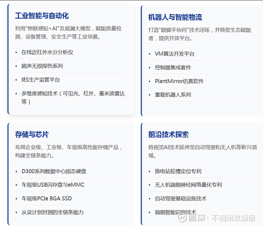 很多人对$海康威视(SZ002415)$ 海康威视的印象还停留在安防监控领域$大华股份(SZ002236)$ $中威电子(SZ300270)$ ,但今天的海康已经成功将业务边界拓展至工业物联网、机器人与智能物流、高端存储芯片等多个高增长赛道。其核心战略是以感知技术为基石,以人工智能为引擎,将技术能力平台化、生态化,赋能千行百业的数字化转型。