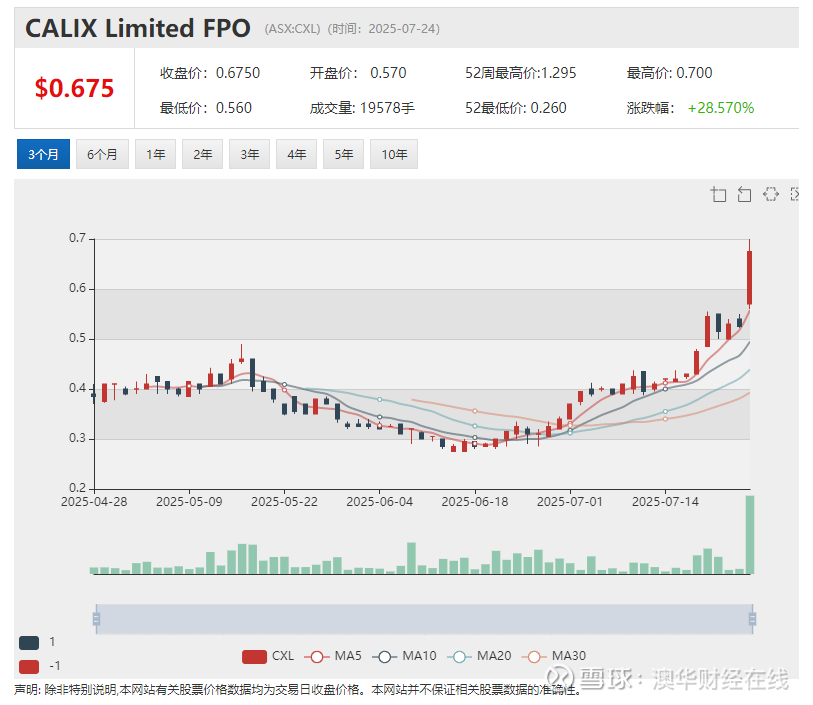 ACB News《澳华财经在线》7月25日讯,环境科技公司Calix Ltd (ASX股票代码:CXL) 股价异动,周四飙涨28.57%。