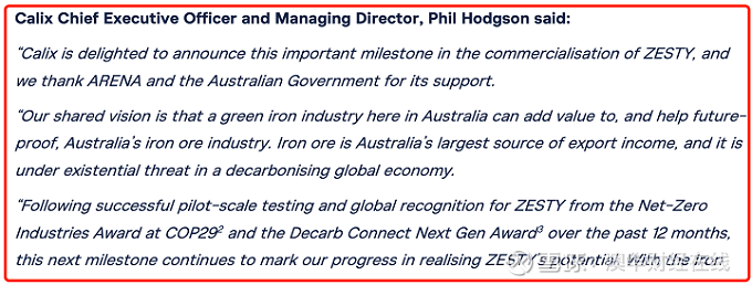 Calix首席执行官兼董事总经理Phil Hodgson表示,继ZESTY技术荣获COP29零排放工业奖和Decarb Connect Next Gen奖等全球性奖项后,绿色钢铁示范工厂的建设将有助于进一步释放ZESTY的商业化潜力。