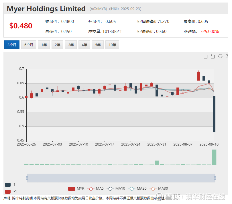 ACB News《澳华财经在线》9月24日讯,百货商场巨头Myer Holdings Ltd (ASX股票代码:MYR)发布2025财报后股价应声重挫25.00%,近一年跌幅扩大至43.20%。