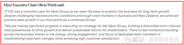 Myer执行总裁Olivia Wirth表示,澳洲和新西兰的宏观经济环境充满挑战,零售市场境况十分严峻,但在完成对服饰品牌Apparel Brands合并后的首个报告期内集团仍实现了销售额正增长。