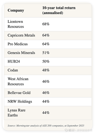 晨星公司还根据10年内的股东总回报率对ASX200成份股进行了考察。股东总回报率包括支付的任何股息以及股票的资本增长。