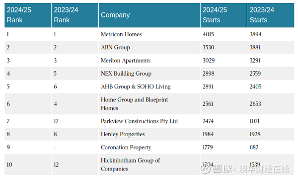 根据2025年HIA住房建筑商百强报告,Metricon Homes连续十年位列榜单第一,2025财年住房开工量为4015套。ABN Group紧随其后,其住房开工量为3530套。