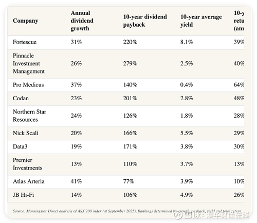 晨星公司根据股息增长、历史收益率和“股息回本率”(即投资者通过股息收回的原始投资金额的比例)等因素进行排名,评选出过去十年股息表现最佳的十大澳交所ASX 200股票。