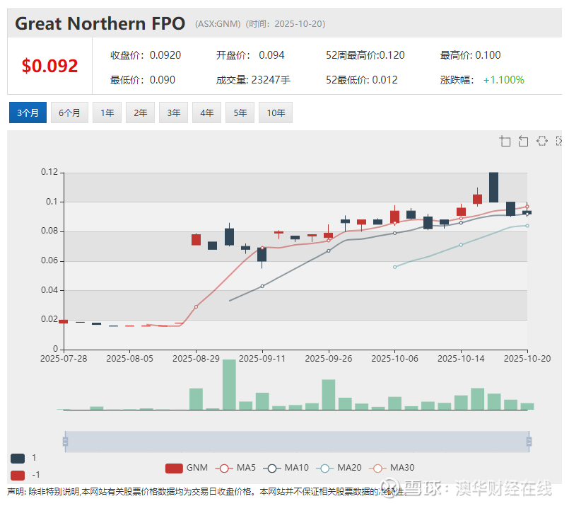 截至 10 月 17 日收盘价 0.091 澳元,相较定增价上涨近 7 倍,定增参与资金账面浮盈约 6 倍。