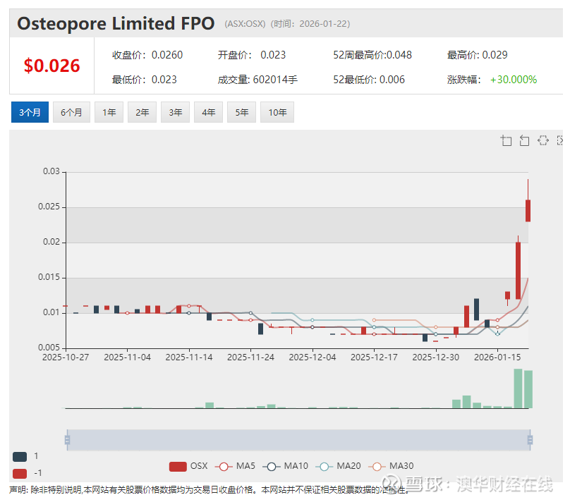 澳华财经在线数据库显示,OSX最新价0.026澳元,已发行股本2.83亿股,市值735万澳元。