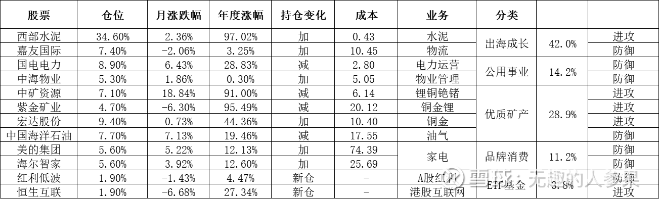 进攻方面,本月加仓了西部水泥、宏达股份,减仓了中矿资源、紫金矿业,开仓了恒生互联ETF。