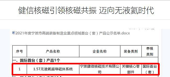 无氦MR的核心技术和部件是“无液氦超导磁体系统”,而宁波健信(新上市的健信超导)是这个核心玩意(无液氦超导磁体技术)的自主研发者,其1.5T无液氦超导磁体系统于2021年被浙江省经济和信息化厅认定为“国际首台(套)装备”, 该公司已申请多项相关专利,包括2024年10月公开的“超导磁体励磁系统及安装方法”(专利号CN 118942835 A)。