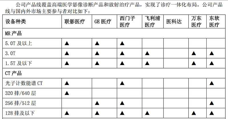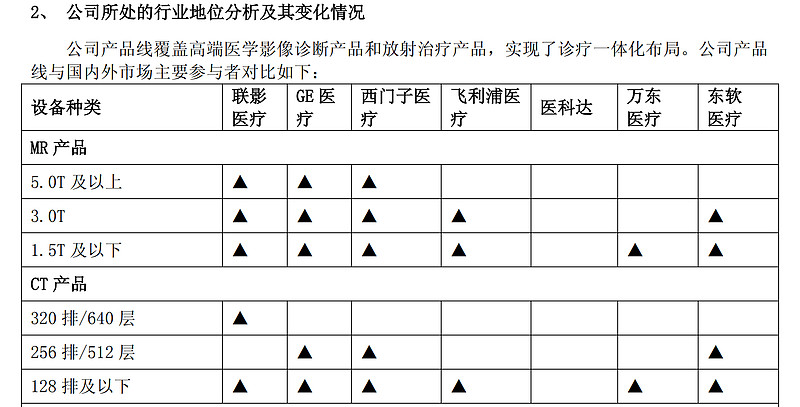 作为对比,夸一下联影医疗的财报质量,为了核对万东医疗CT的排数和层数之谜,翻了联影的财报,上面对产品线得参数以及竞争对手得情况通过表格得方式简单,清晰得以展示,这是2024年年报中的表格: