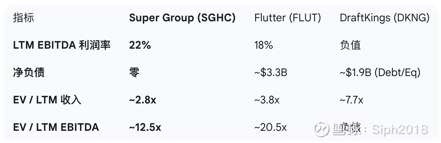 如上表所示,无论是从反映盈利质量的EBITDA利润率,还是从财务安全性的净负债来看,SGHC都全面优于其主要竞争对手。然而,在最关键的估值指标EV/EBITDA上,SGHC约12.5倍的估值,不仅远低于Flutter($Flutter(FLUT)$ )的约20.5倍,更是与亏损的DraftKings($DraftKings(DKNG)$ )无法直接比较。市场给予其每一美元盈利能力的定价,远低于其应得的水平。