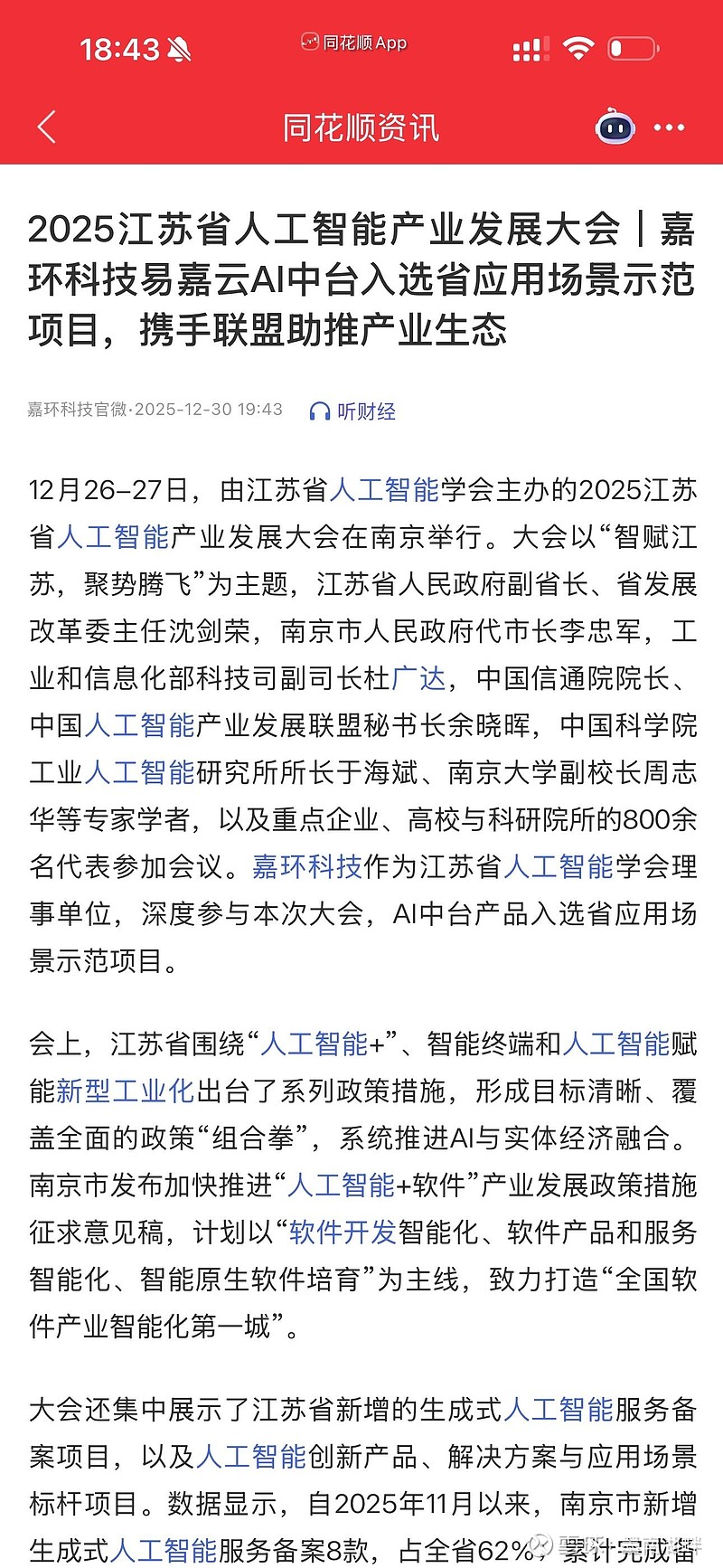 在AI领域,嘉环科技是“算力 + 模型 + 数据 + 应用 + 人才 + 生态” 全栈服务供应商,业务聚焦 AI 基础设施服务、数据服务、大模型行业应用服务、人才服务等领域,可为政府、企业及高校等客户提供全方位的算力运营、方案咨询与行业解决方案服务。随着“人工智能+”行动的持续深化,公司将继续强化政策响应与生态协作,推动人工智能技术在更广范围、更深层次实现融合应用,助力江苏乃至全国产业智能化升级与经济高质量发展。