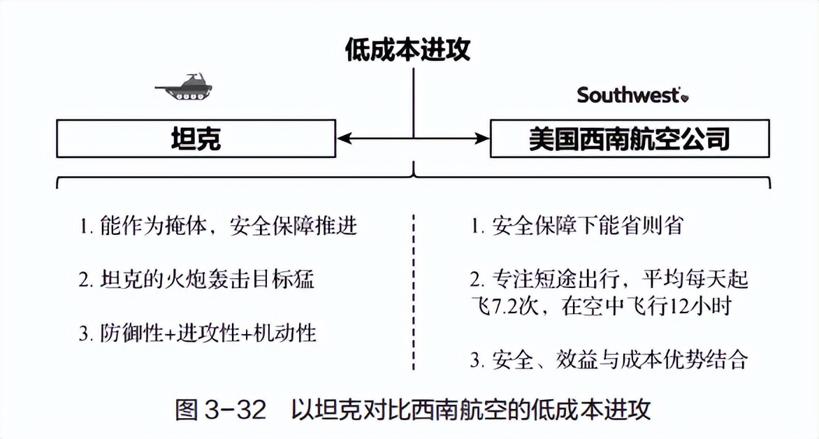 如图 3-32 所示,坦克的第一个特征是可以作为掩体,能在保障安全的情况下不断推进。而西南航空降低成本的首要方法是在保障安全的前提下通过精细化管理,采取各种能省则省的方式,比如飞机上没有报纸、杂志、餐饮;各地机场没有转机业务、没有服务人员;飞机票全是电子票,登机时 20 人一组拿一个塑料登机牌,座位随便坐,先到先选好座位;一般飞机最低配置 6个服务员,西南航空机上可以做到只有 2 个服务人员,以此降低成本。