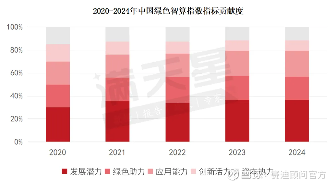 从各指标贡献度来看,发展实力、应用能力指标贡献度持续提升,绿色智算各领域有较大增长空间。2024年发展实力、应用能力指标贡献度分别较基期上升7个、3个百分点,表明规模扩张和场景拓展成果显著,对绿色智算的可持续发展发展起到重要作用,为未来跃升奠定坚实基础。五年来,绿色助力指标贡献度波动中基本稳定在20%,表明绿色与智算整体实现了协同发展,匹配度较高。创新活力与资本热力指标经历调整,绿色技术创新转向体系化系统化,绿色智算上市企业的发展理念从规模扩张转型为质量优先。
