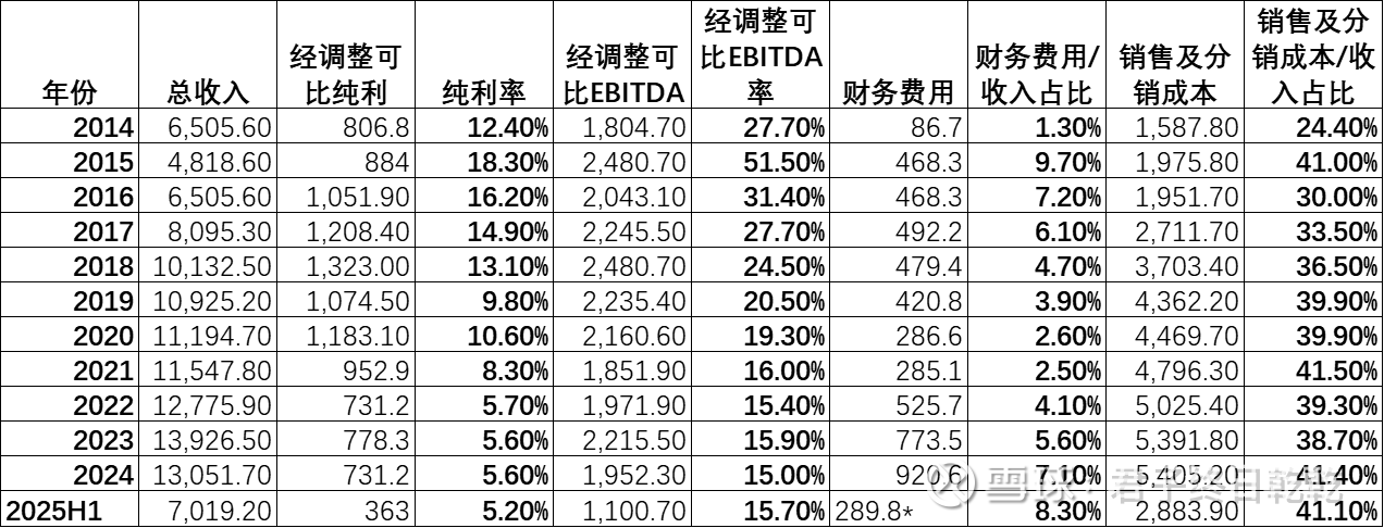 公司2014-2024平均经调整净利率核心差异:H&H国际8.9%高并购杠杆拖累净利率