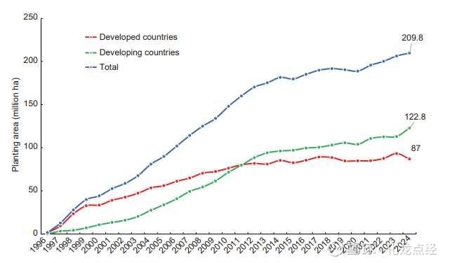 2024年,全球共有28个国家实现了转基因作物的商业化种植,总面积达2.098亿公顷,估计占全球耕地总面积(约15.5亿公顷)的13.5%,发展中国家种植推广加速。