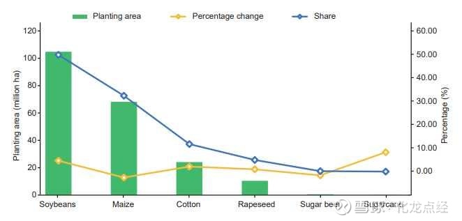 前五大生产国美国、巴西、阿根廷、印度和加拿大合计占全球转基因作物种植面积的90.6%。