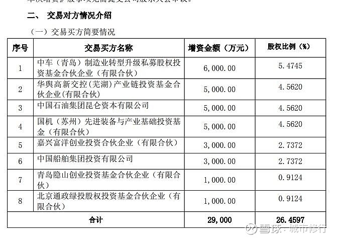 因此京城按8亿的市值融资2.9亿还是吸引了一帮资本圈的大佬(中车资本、中石油、中国船舶、国机集团、宁德时代、北京国资),并签署了《增资协议》及其补充协议。根据公告,8家投资者,合计增资2.9亿元,占股26.4597%。投后估值为10.96亿元(投前估值为8.06亿元)。还是熟悉的味道,这七大豪华股东阵容足以孵化出一只氢能行业的独角兽企业,在氢能曙光将现之时用几千万就入股了这么一只未来有望市值千亿的企业。那么京城是不是也应该重新估值了! $厚普股份(SZ300471)$ $中材国际(SH600970)$