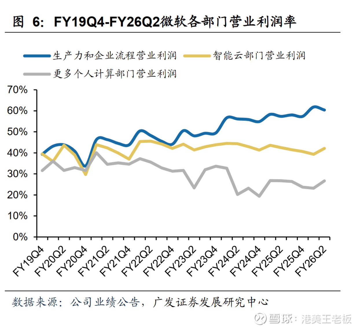 根据2026财年Q2财报,微软生产力和企业流程部门收入达 341.16亿美元,同比增长 15.9%;而相比之下,个人计算部门(含Windows)仅为142.5亿美元,且同比出现了下滑。更重要的是,生产力和业务流程板块的运营利润率多个季度维持在 50%以上,是微软名副其实的现金奶牛。