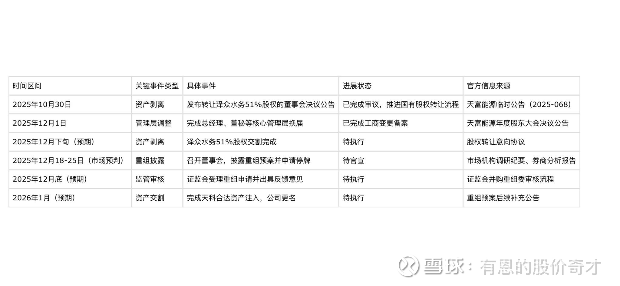 ◦ 天科合达的审计、评估工作已收尾,重组草案由券商内部定稿,且天富能源在12月1日完成了总经理、董秘等核心管理层调整,为重组扫清合规障碍。