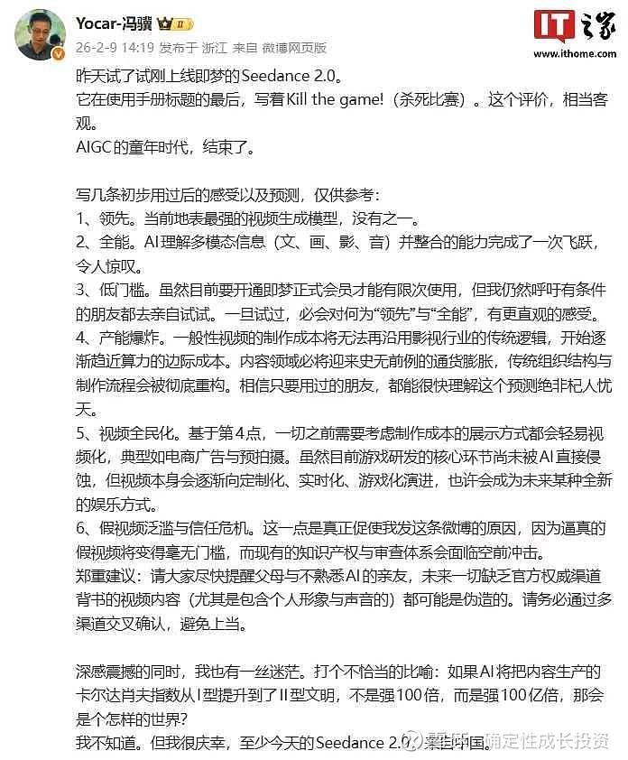 【AI应用爆了】字节推出seedance2.0,效果炸裂。看看游戏大佬是如何评价的。领先、全能、低门槛、产能爆炸、全民化、担心造假因为太真实了。广告、电视、电影、动漫、游戏等行业都会被seedance重塑!人人当导演时代来临了,去年春节sora还只是想象,今年seedance2.0已经基本实现。AI+影视、在线网文的几个相关公司直接涨停。后续,可以期待今年AI购物、旅游、教育、医疗、企服等等应用都会轮番出爆款。。。$易点天下(SZ301171)$ $汉得信息(SZ300170)$