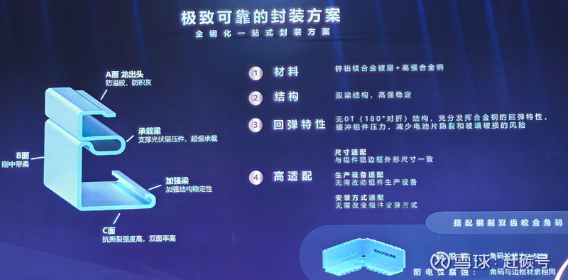首先是材料选择,并非所有钢材都能制作钢边框,中来选用的是锌铝镁合金镀层的高强合金钢。锌铝镁合金镀层具备自修复效果,当镀层被划伤或腐蚀后,能像皮肤的创可贴一样实现自我修复,大幅提升耐腐蚀性;其次是结构设计,目前各钢边框生产企业都有自主的结构设计并申请了专利。中来采用双梁结构,让钢边框的强度更高、稳定性更好,同时设计了无0T(180° 对折)结构,避免钢材因180°对折产生新断面,也能充分发挥合金钢的回弹特性,缓冲组件压力,减少电池片隐裂和玻璃破损的风险。