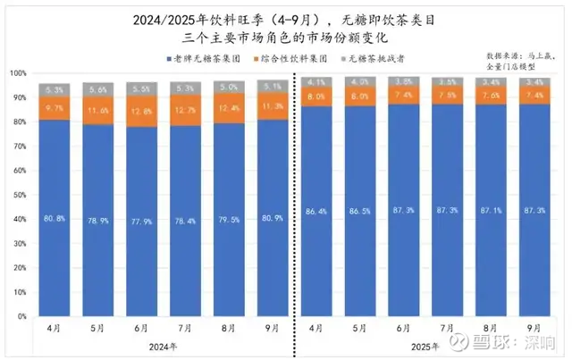 据马上赢数据,农夫山泉和三得利组成的“老牌无糖茶集团”牢牢占据市场大半壁江山,截至今年9月合计市场份额达到87.3%,较去年同期上升6.4%,优势进一步放大。但康师傅、统一、娃哈哈、可口可乐、维他等组成的“综合性饮料集团”,以及果子熟了、茶小开为代表的“无糖茶挑战者”,占有率正不断收缩。其中,第二梯队品牌的份额从去年9月的11.3%降至7.4%,第三梯队市场份额则从5.1%收缩至3.4%。