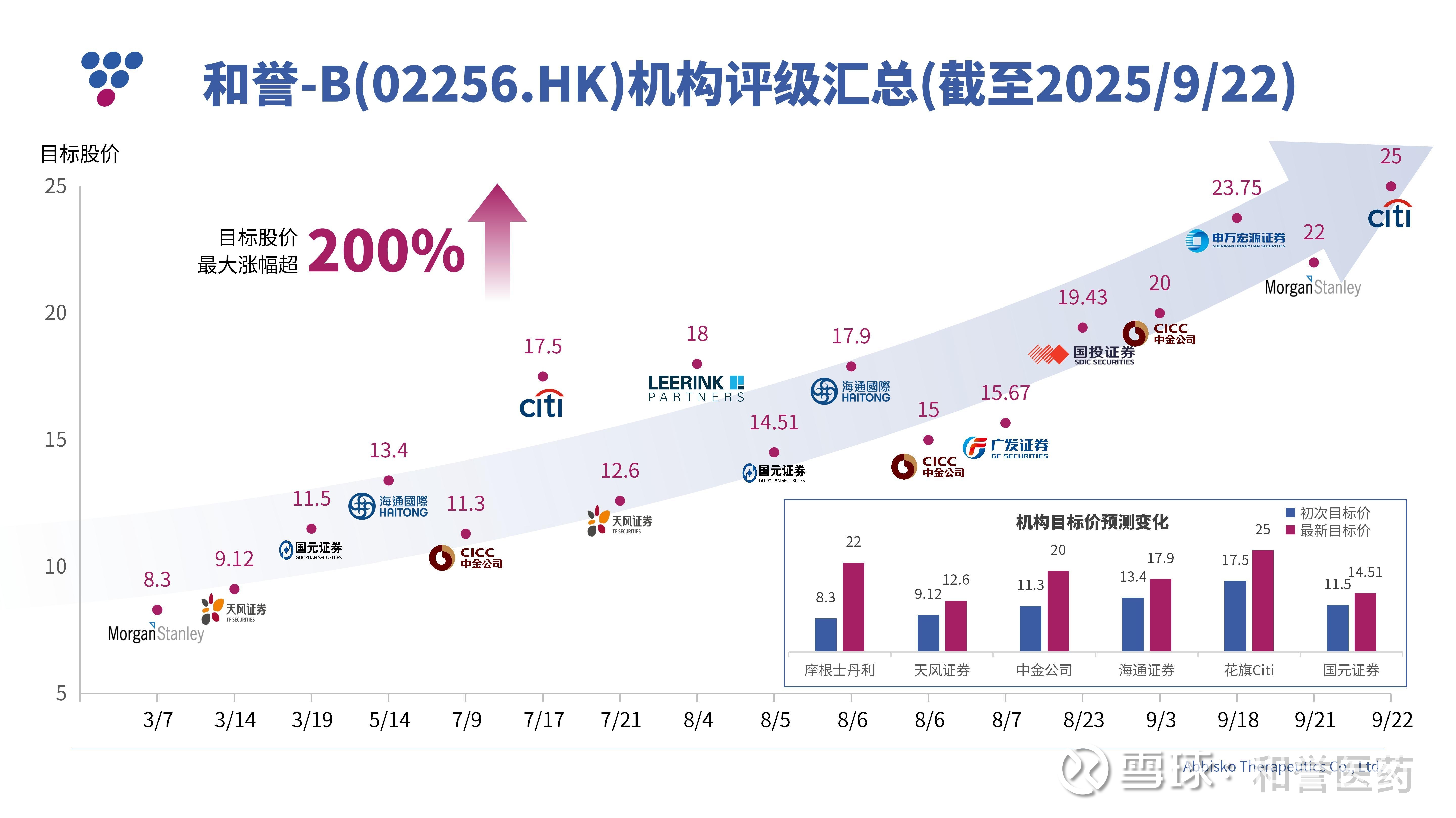 自年初以来,$和誉-B(02256)$ 在产品管线推进与商业合作方面连续取得重大突破,获得国内外资本市场高度认可,先后被纳入明晟公司(MSCI)全球小盘股指数成分股和富时(FTSE)中国小盘股指数,多家权威机构陆续发布看好报告!