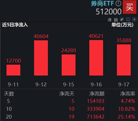伴随着牛途持续,券商板块持续获得资金关注。上交所数据显示,券商ETF(512000)最新单日再获资金净流入3.59亿元,近15个交易日资金连续净流入合计达51.91亿元。