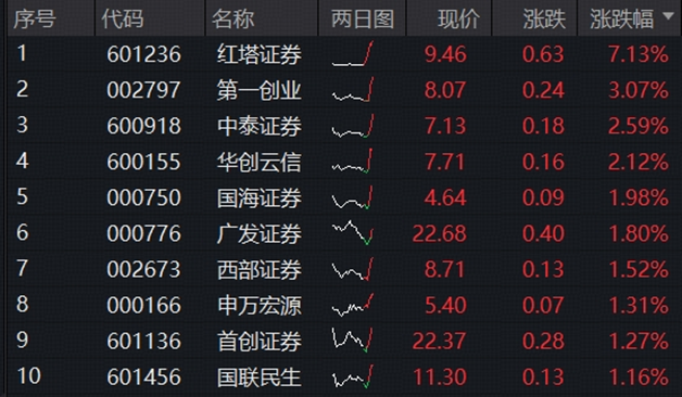 板块个股多数飘红,红塔证券领涨7%,第一创业涨超3%,中泰证券、华创云信、国海证券涨超2%,广发证券、申万宏源等涨逾1%。$东方财富(SZ300059)$ $红塔证券(SH601236)$
