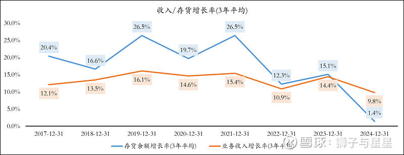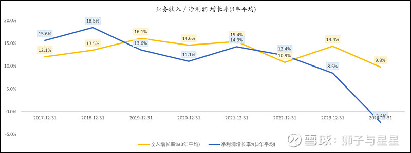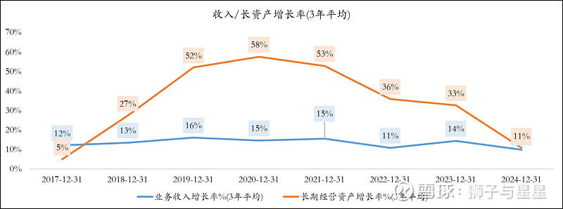 收入与资产增长率做一个3年均值钝化处理,收入增长率每年平稳在十几数,长期资产一个完美的上抛物线