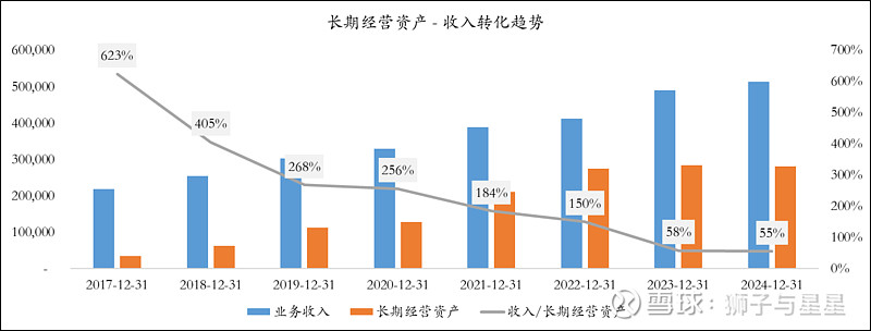 投资速度快于收入增速,长期资产收入转化率不高(2021年因为会计准则变化,长期经营资产含了之前表外的使用权资产,但是整体趋势不影响)