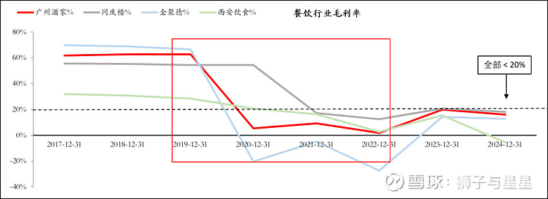 销售费用2020年开始减少一半,主要是因为会计准则变了,简单说,以前房租、装修费这些都算在"销售费用"里,现在都算进"营业成本",导致毛利率"技术性"下降。但是很不巧,疫情又来了,导致餐饮毛利率更低,可以看到红框里餐饮行业“疫情+会计准备变更”,毛利率全部大幅降低,2023年开始有所恢复,但毛利率都<20%