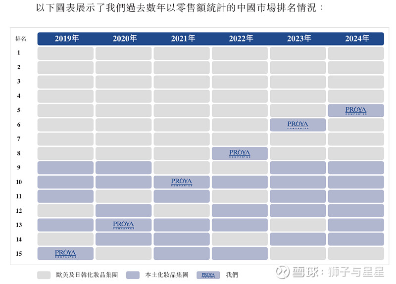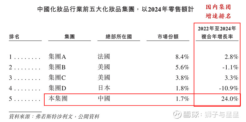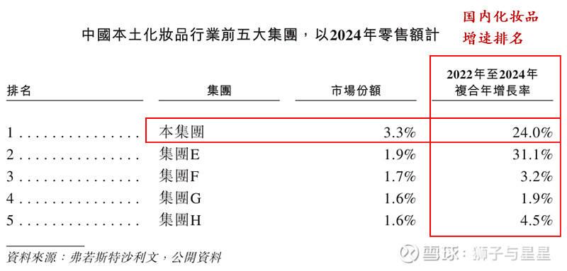 - 国内排名,基于最新港股招股说明书,按2024年零售额计算,珀莱雅属于本土品牌第一,国内第五,作为国内龙头,已经开始与外资品牌肉搏竞争