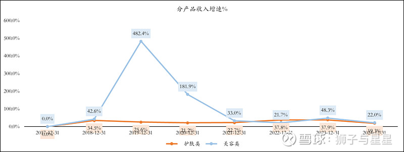 b) 美容类,2019-2020年增速非常高,第一篇历史简介里提到“2017-2023年上市与多品牌扩张期,其中:2019年收购彩妆品牌彩棠,切入彩妆赛道”同时推出"印彩巴哈彩妆粉底液", "红宝石"彩妆系列等爆款大单品,叠加线上渠道打通,收入暴涨,即使后来增速下落,但也是>20%的速度,很高了