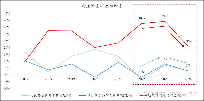 b) 其他化妆品公司收入增速趋势都是下降,与社会消费品零售总额收入增速趋势一致
