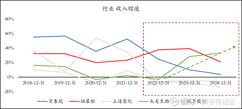 c)但是珀莱雅收入增速趋势与全行业一致,行业增长公司增长,行业下降公司下降