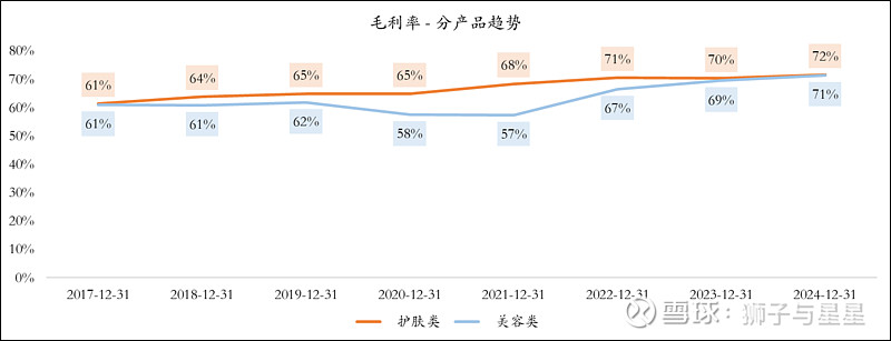 a) 无论护肤类还是美容类,毛利率趋同>70%