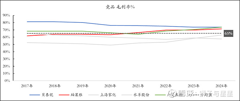 行业均值65%,头部珀莱雅、贝泰妮收敛到70%。丸美生物单提一下,市值排第五,随着2023-2024年推出爆款后,毛利率也上升到头部水平;“其他等等”的毛利率在50%-70%之间,化妆品整体属于高毛利率行业